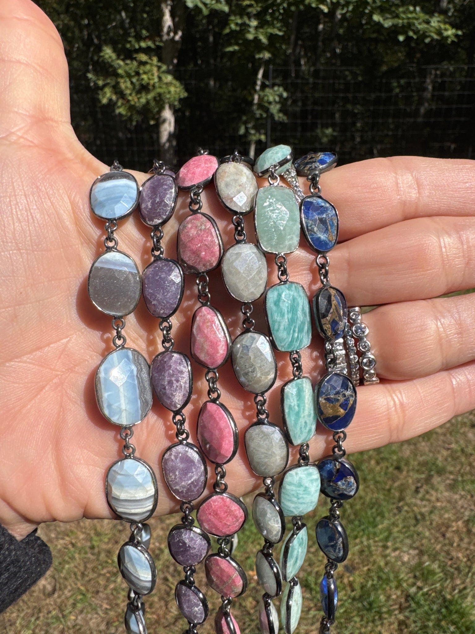 Bracelets measure 15”. Each stone is paired with a perfect sterling silver chain to complement the gemstone. Sterling silver clasp with pave diamonds on both sides. Add a beautiful charm pendant (sold separately).