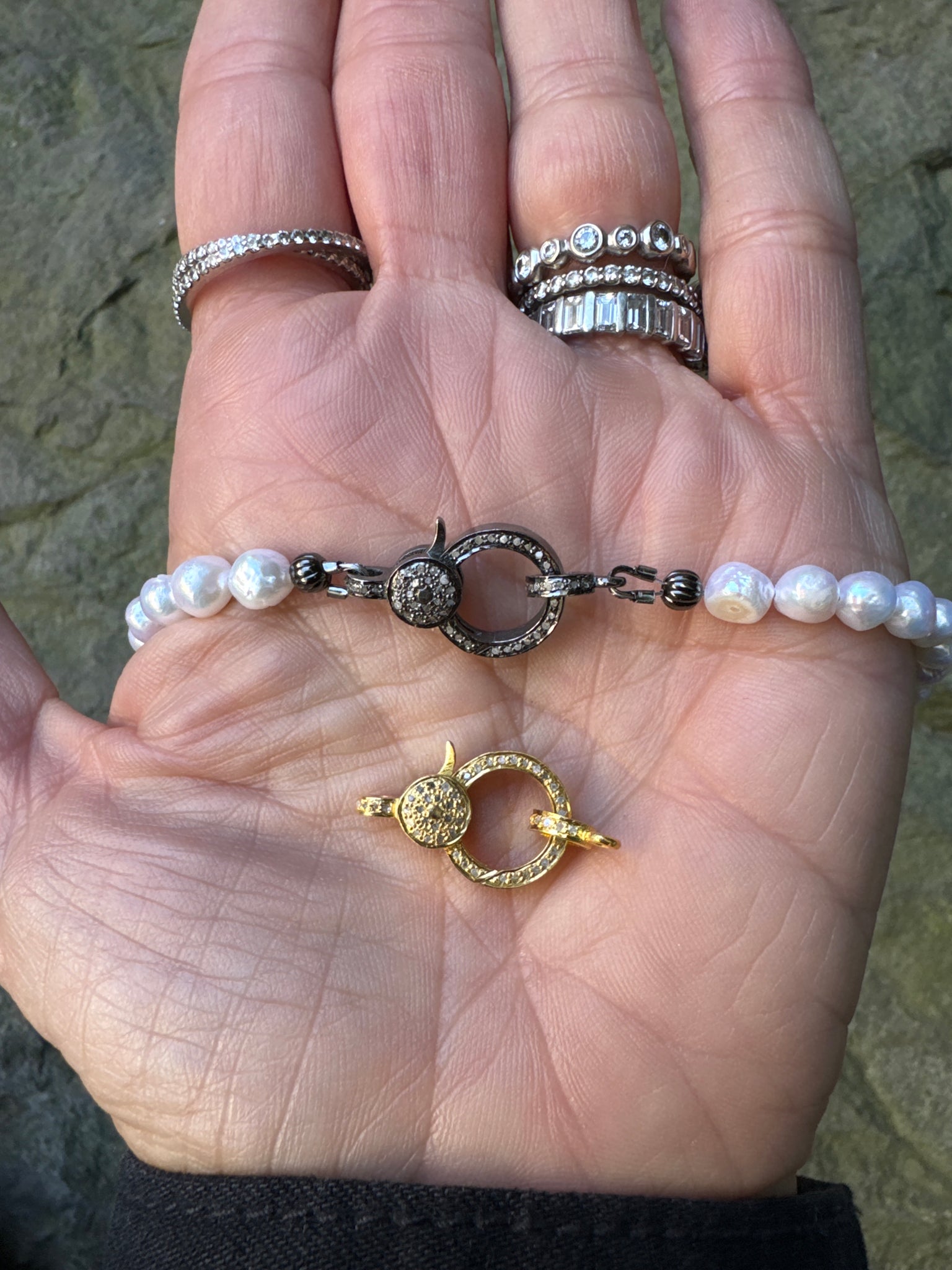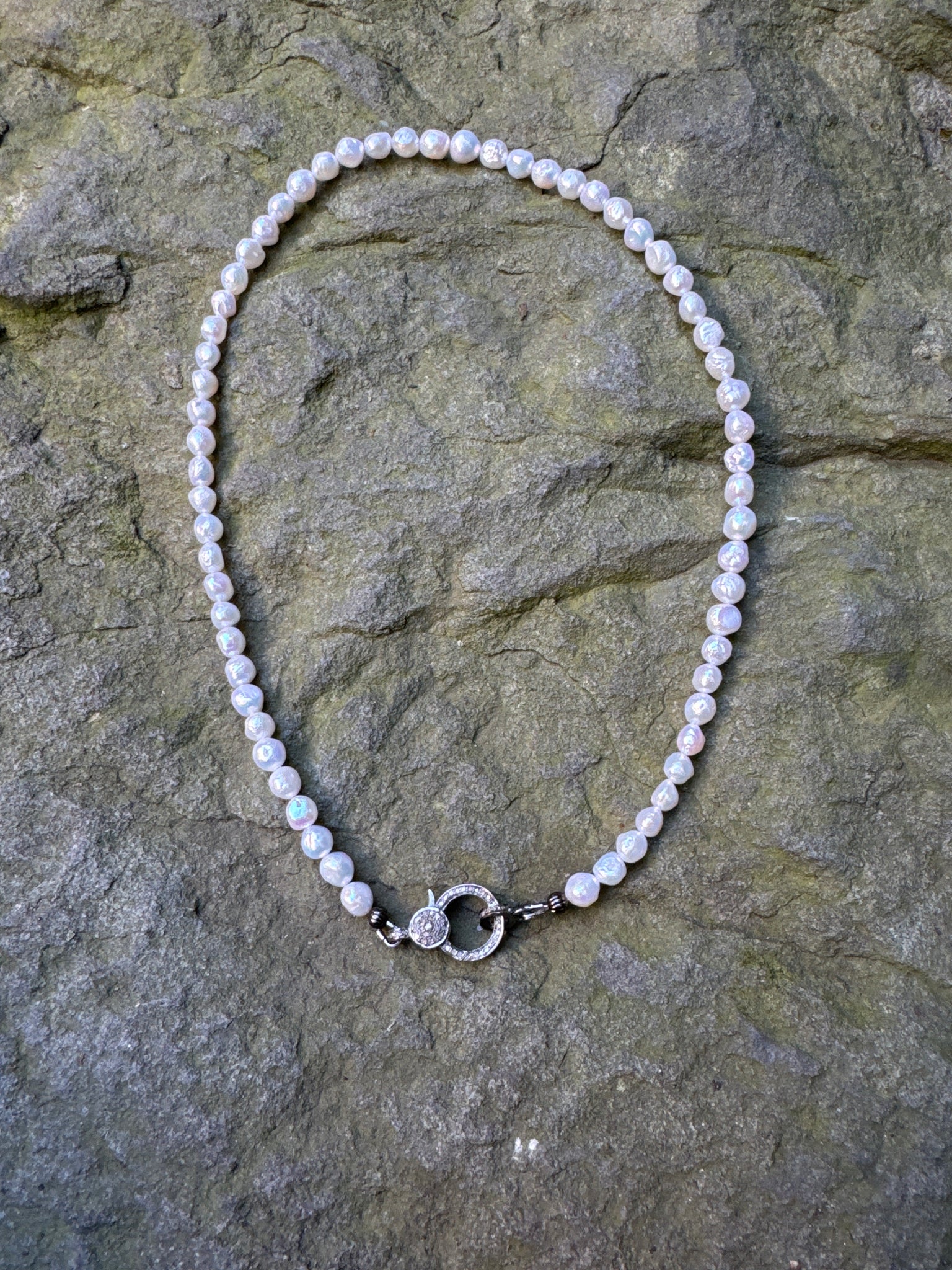 Necklace measures 17”. Pearls measures 4-5mm. Sterling silver clasp with diamonds on both sides. Pendant sold separately.