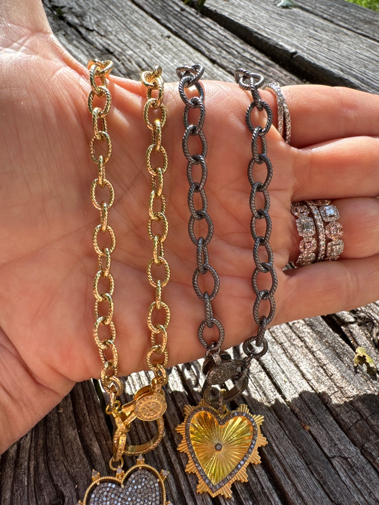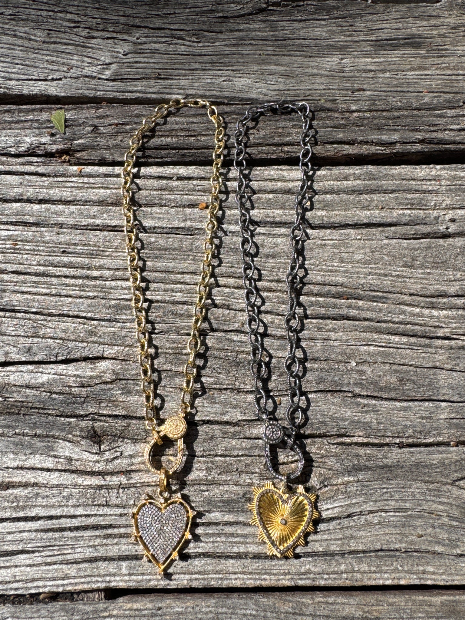 Necklace measures 18”. Sterling silver chain. Gold vermeil on gold chain. Sterling silver clasp with diamonds on both sides. Pendants sold separately.