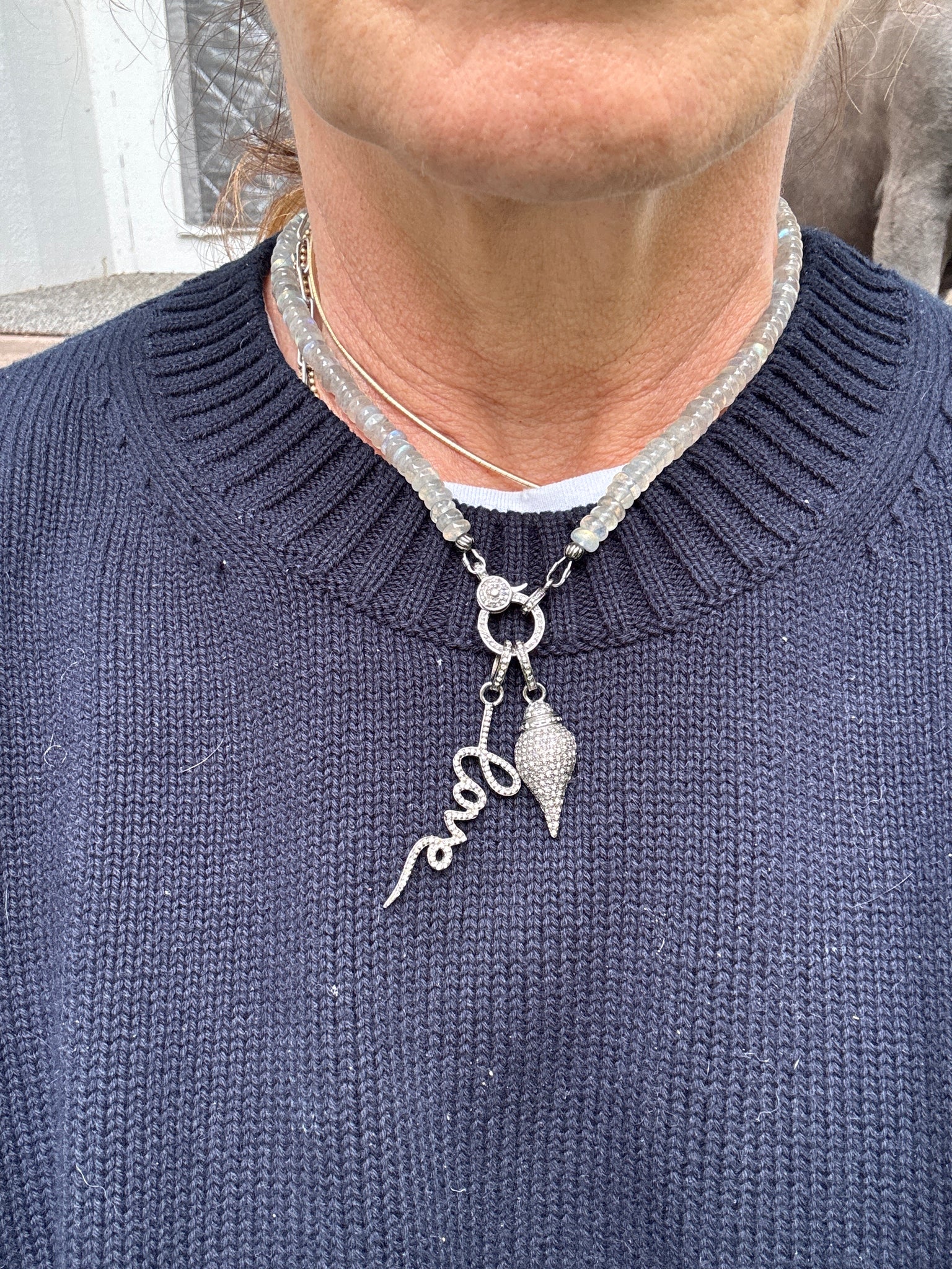 Pendant measures 48mm long. Set in sterling silver. Hollow on the reverse side. Paired with a labradorite necklace sold separately.