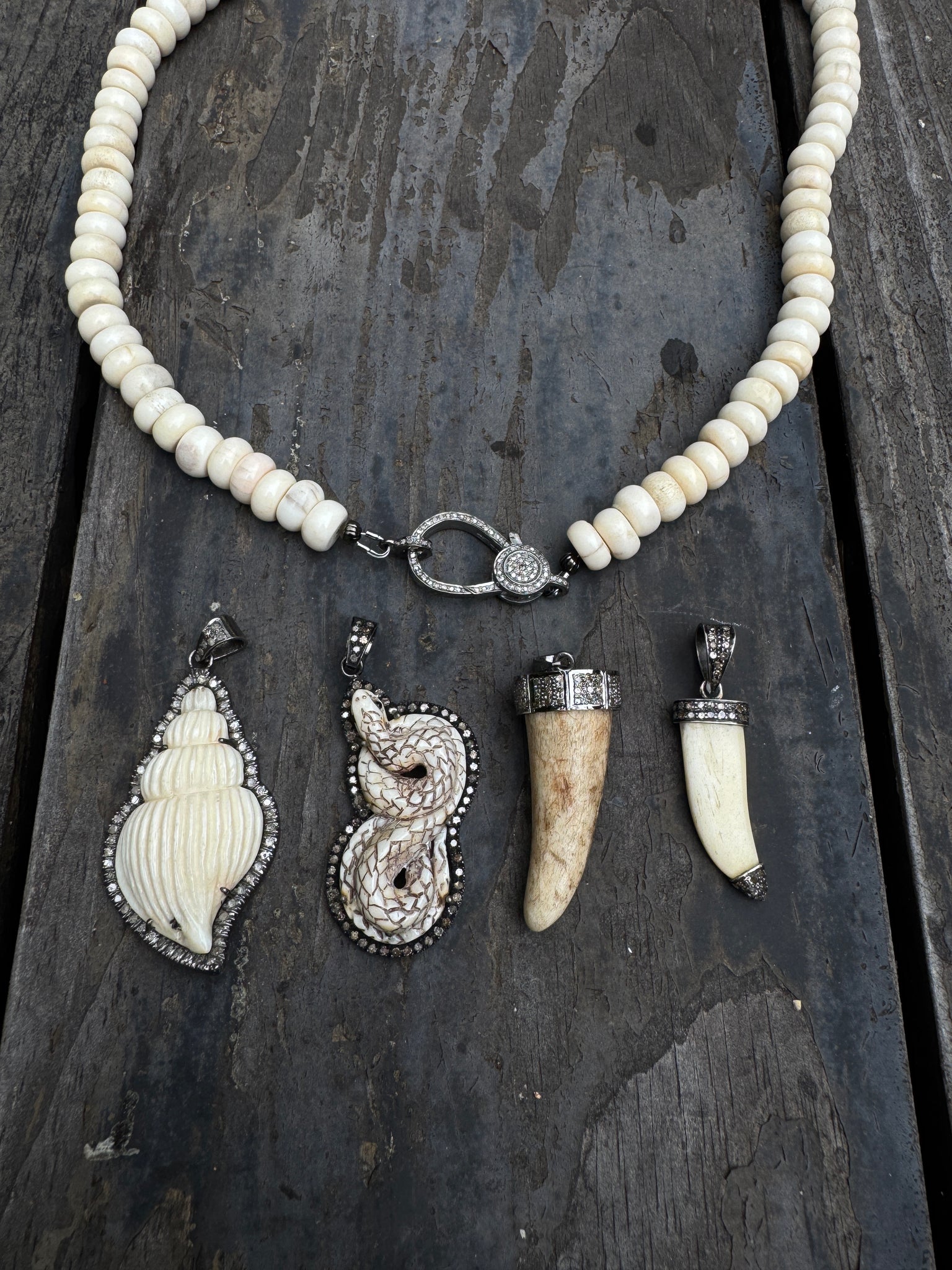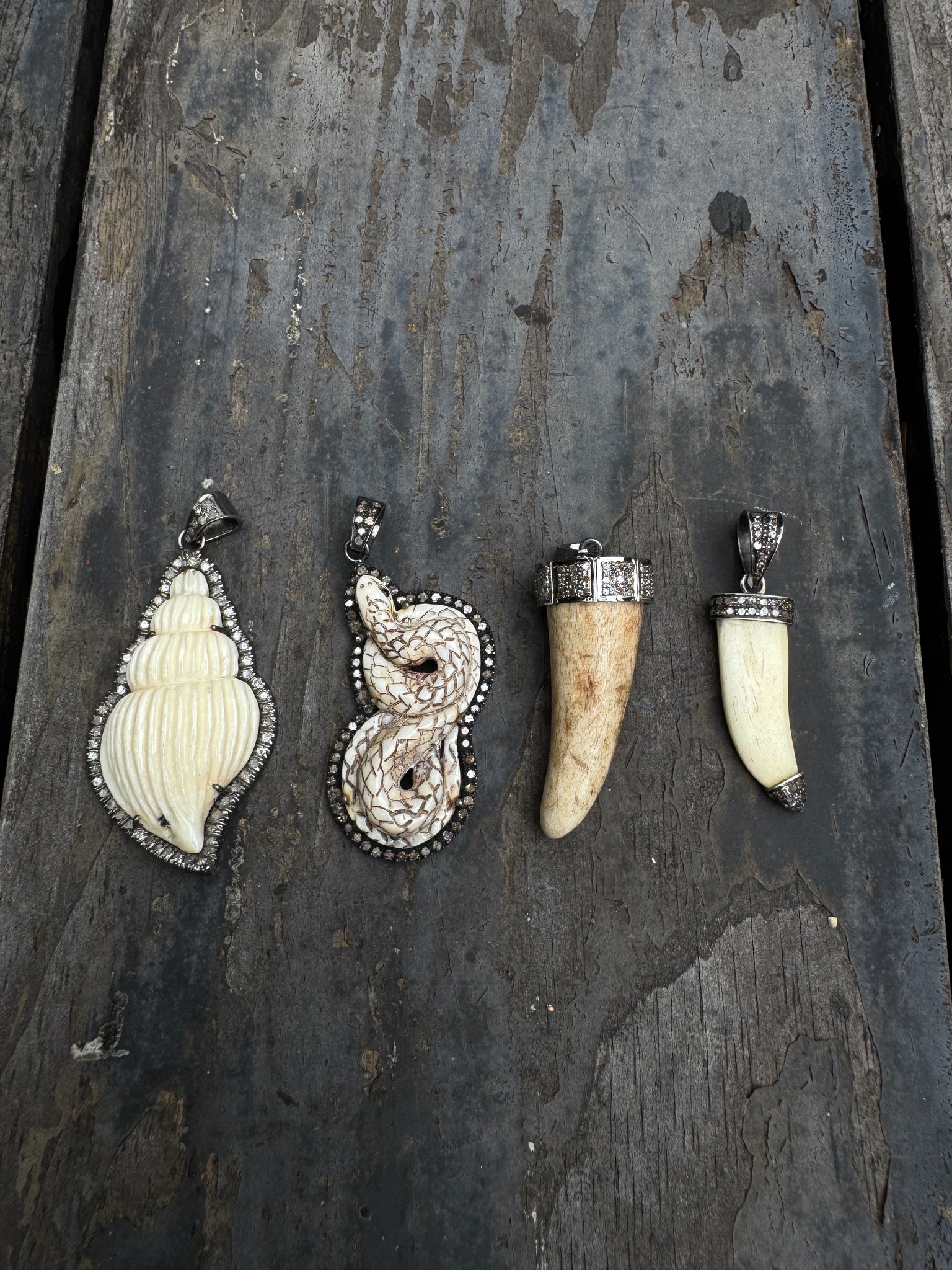 Bone hand carved snake measures 23x56mm. Bone glad horn measures 12x44mm. Bone hand carved conch shell measures 28x49mm. Bone round horn measures 17x50mm. All set in sterling silver. Each pendant has a fabulous detail of diamonds to enhance design. Stunning!! Moose antler beaded necklace sold separately.