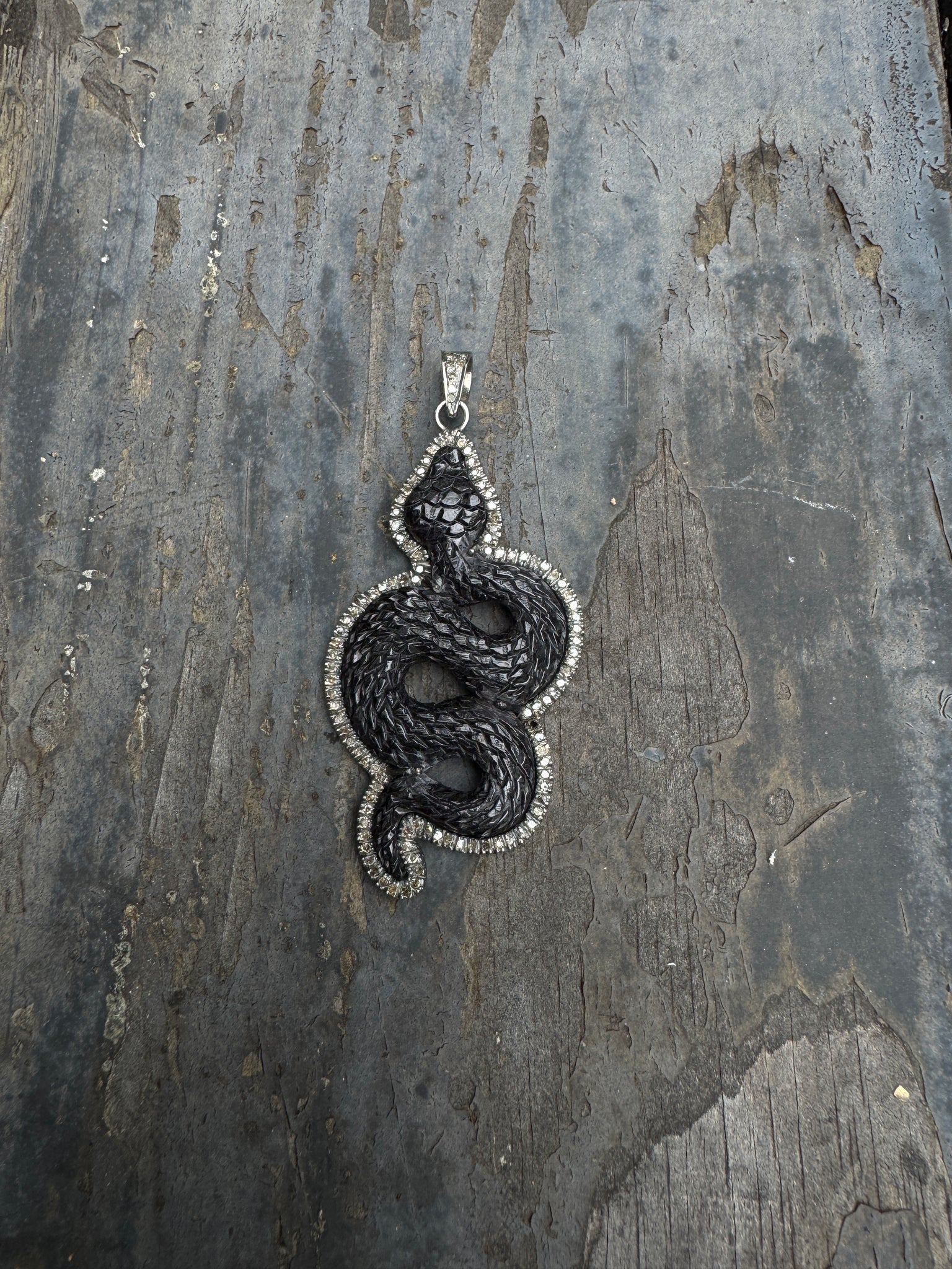 Pendant measures 23x56mm. Set in sterling silver. Hand carved snake with diamond border and bail. Paired with black spinel beaded necklace sold separately.