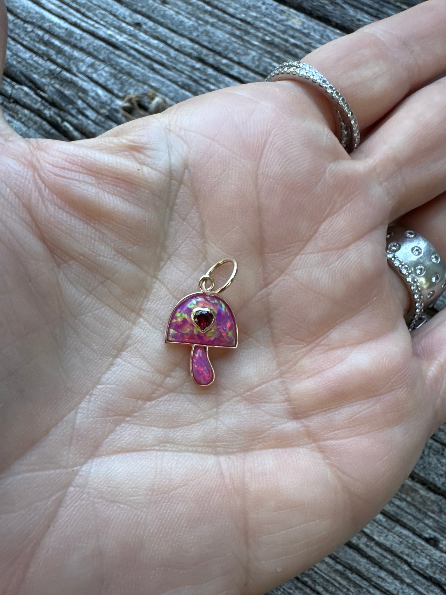 Sweet small pink opal mushroom measures 12x22mm including bail. Tiny ruby solitaire inside mushroom cap.