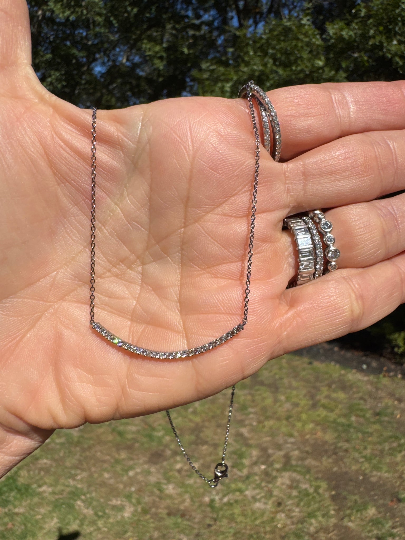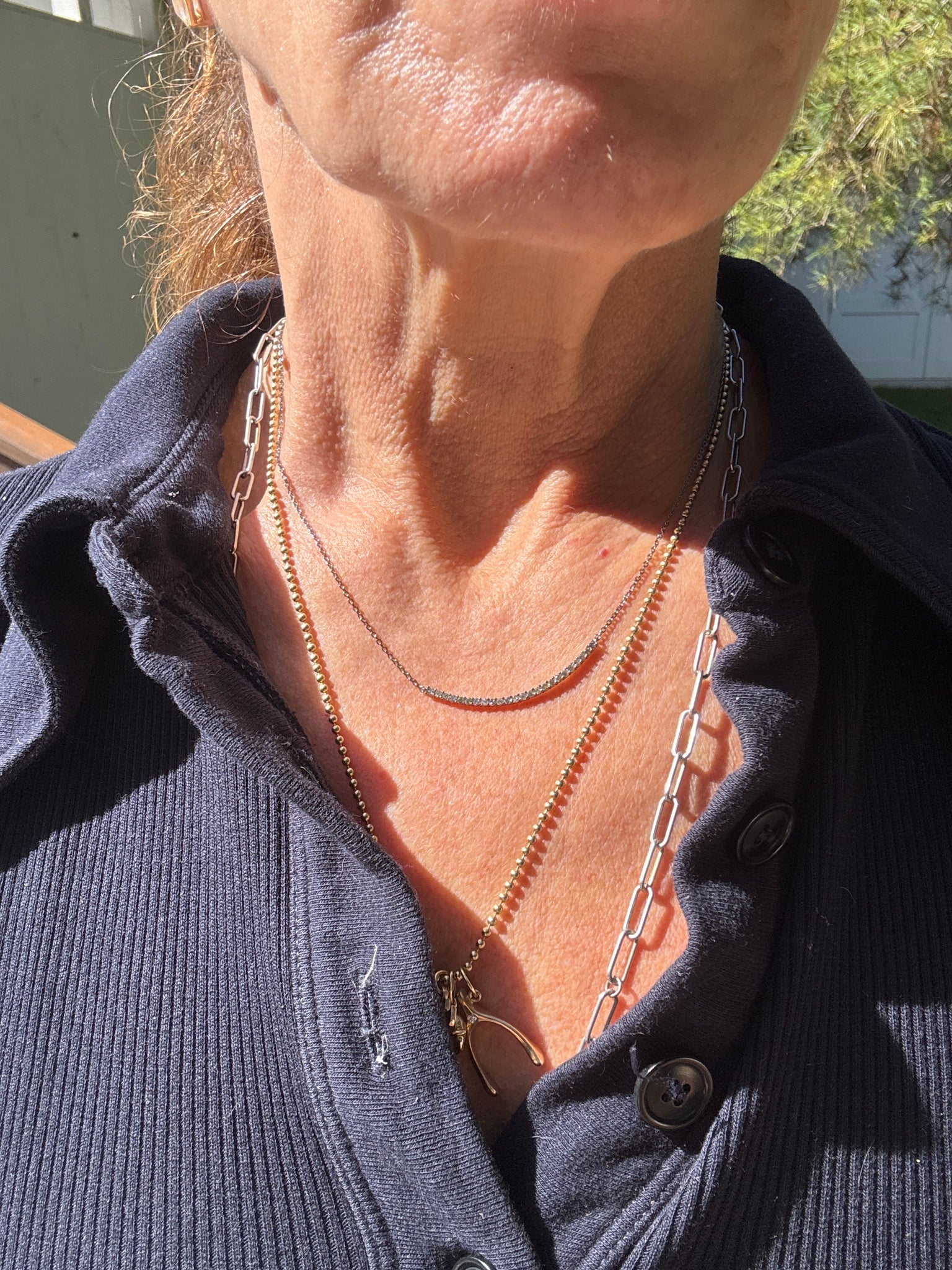 Necklace is adjustable from 15-18”. Absolutely gorgeous. The perfect amount of sparkle on your neck to wear alone or to layer with other chains and beaded necklaces.
